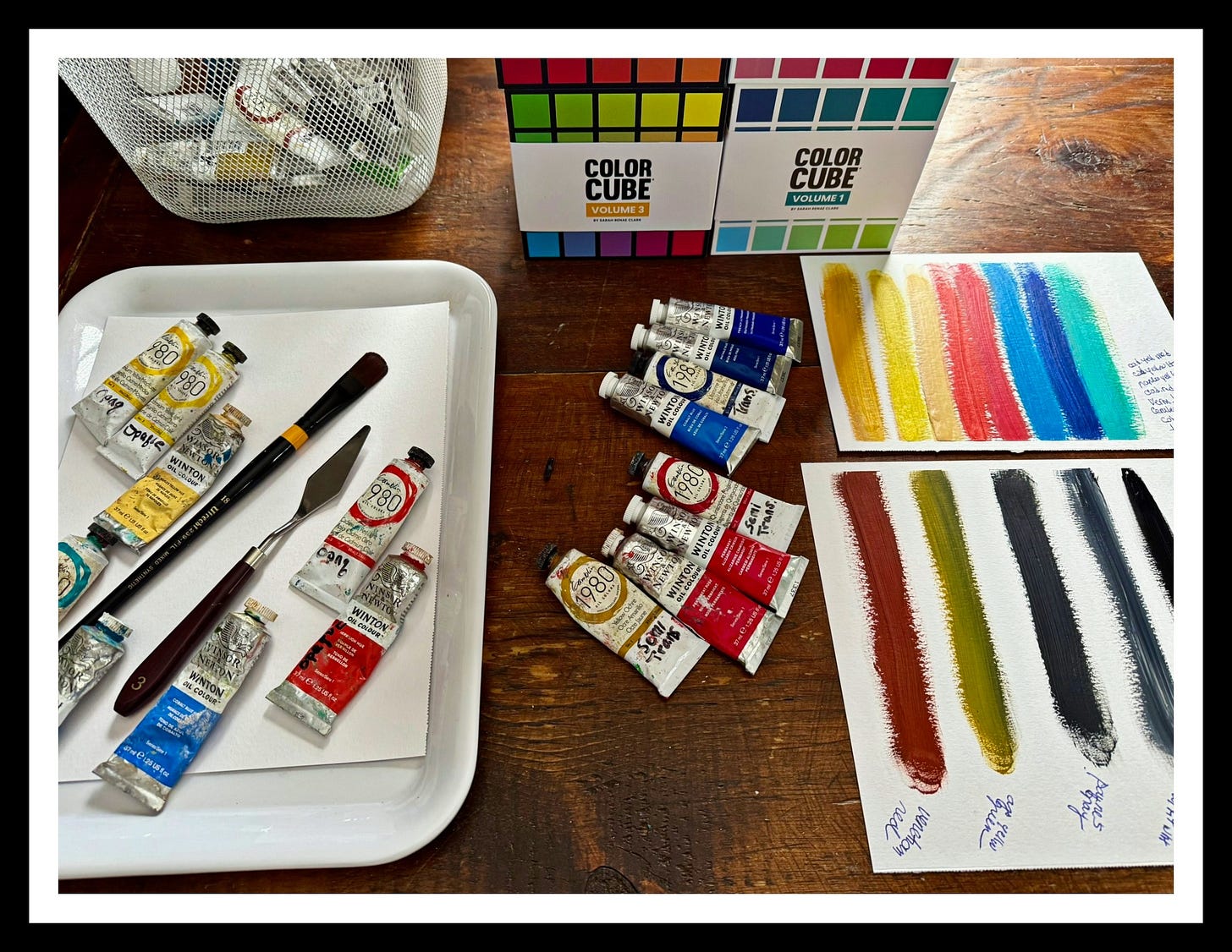 So for the last two mornings, I’ve bellied-up to my vintage farm table, and with lights flickering and drifts piling up, I explored. Opaque versus transparent paints. The alchemy of color theory. Last week’s delivery of color cubes—one thousand variations of palettes—is a quiet invitation to explore more.